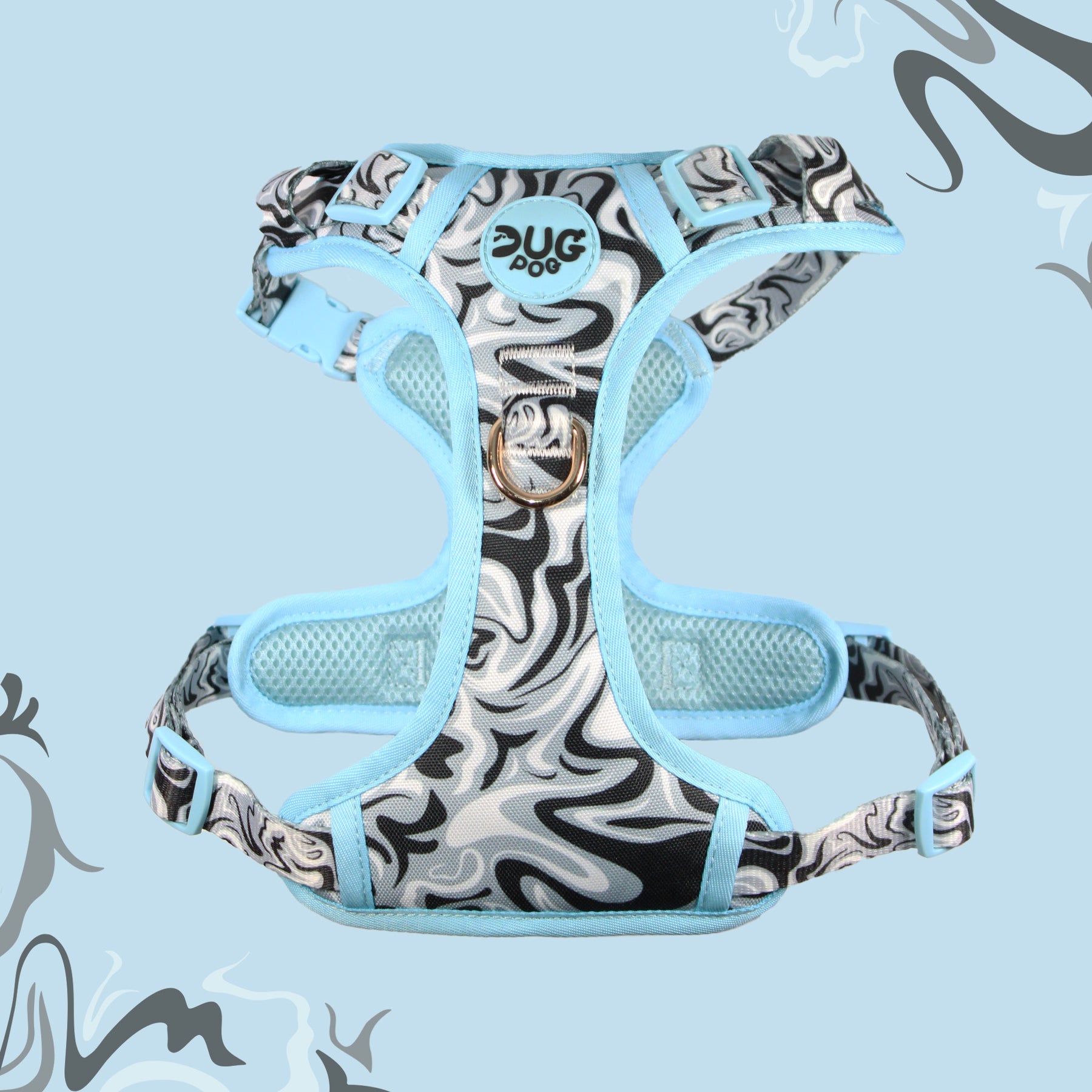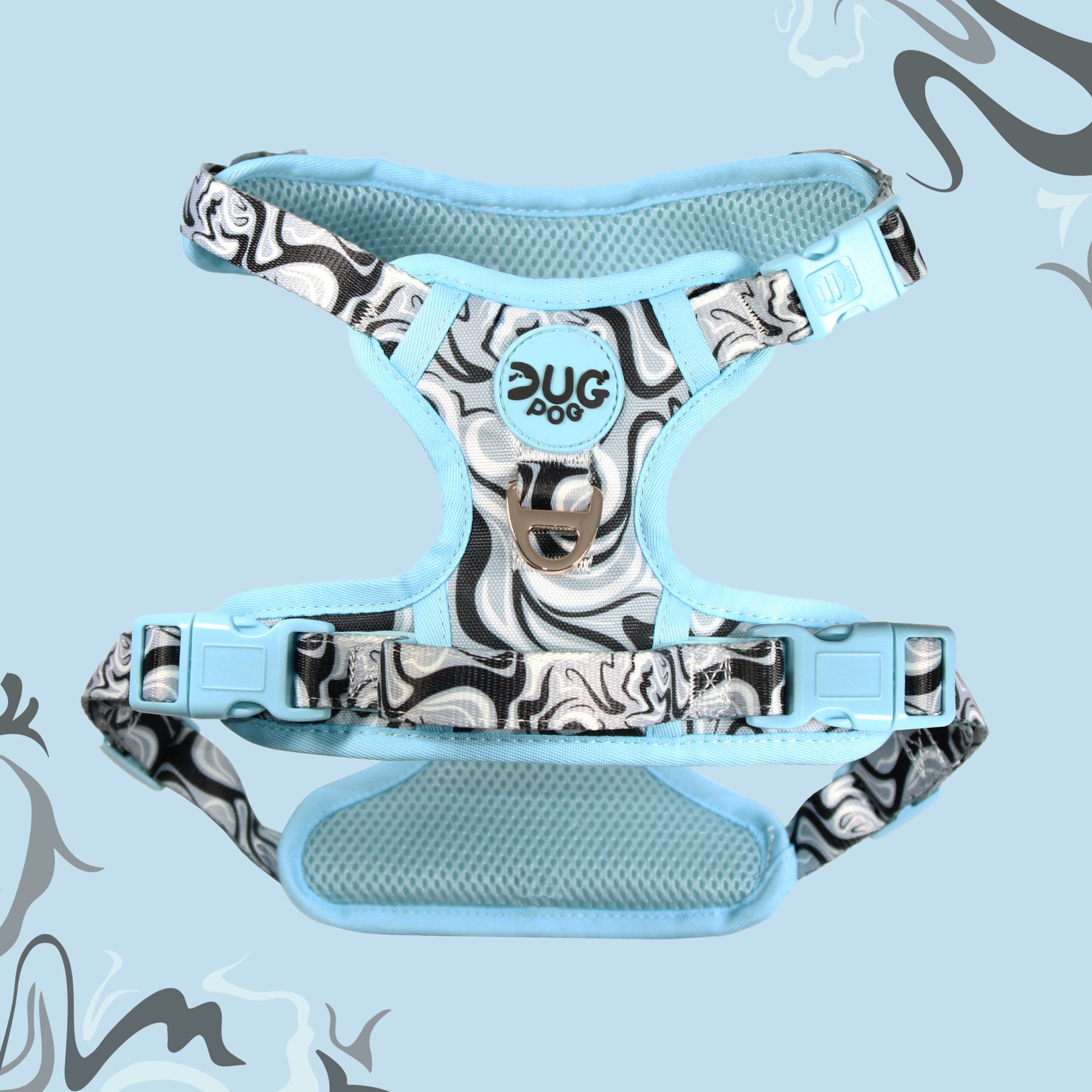 Bark to Black features flowing black, grey, and white swirls, finished with soft baby blue binding for a calm, modern contrast. Bold yet balanced, this design is timeless, versatile, and made to suit every dog and every walk.