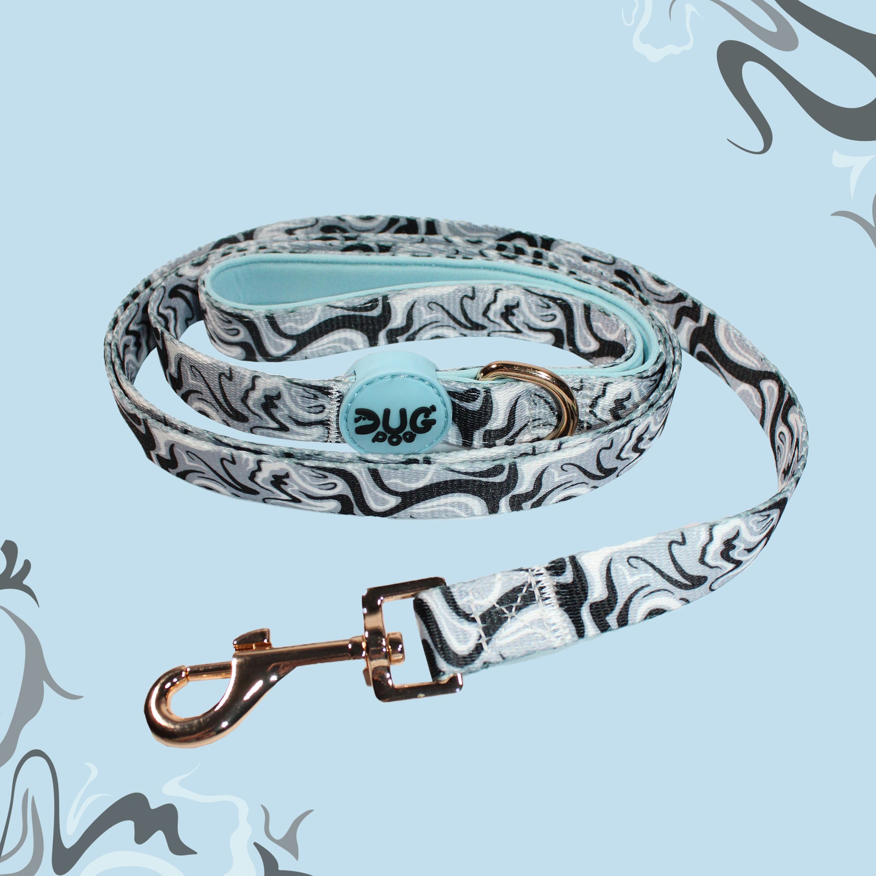 Bark to Black features flowing black, grey, and white swirls, finished with soft baby blue binding for a calm, modern contrast. Bold yet balanced, this design is timeless, versatile, and made to suit every dog and every walk.